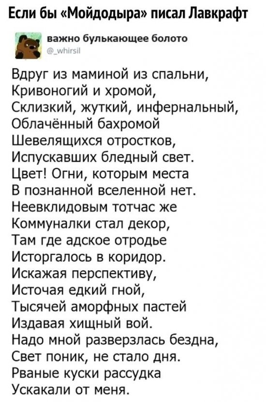 В тридевятом царстве, в полицейском государстве жили были старик со старушкой — у самого телеэкрана в избушке. Попросил бабу дед — испеки мне колобка на обед. Посмотрела бабка рецепт в интернете, принялась искать муку в буфете; обыскала балкон, обыскала туалет, пробовала одолжить у соседей — получила хамство в ответ.